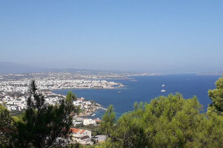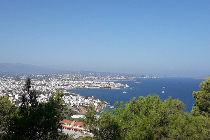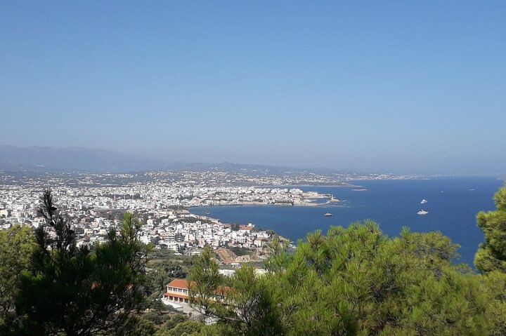 Our journey begins atop the Hill of Prophet Elias, offering panoramic views of Chania's sprawling landscape from one side and blue waves and White Mountains on the other.