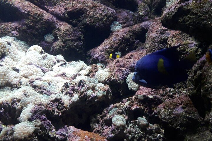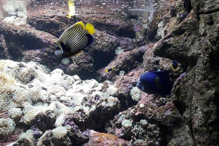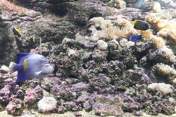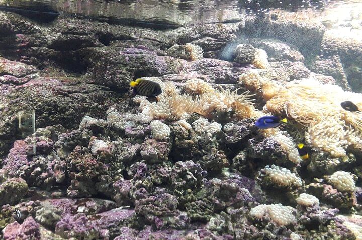 • Sharks, rays, jellyfish, and colorful reef fish in a modern aquarium